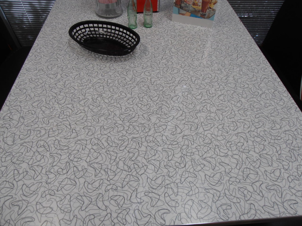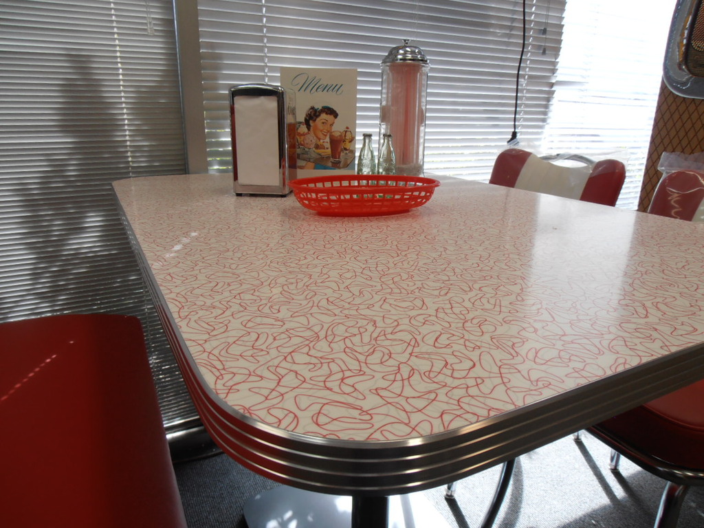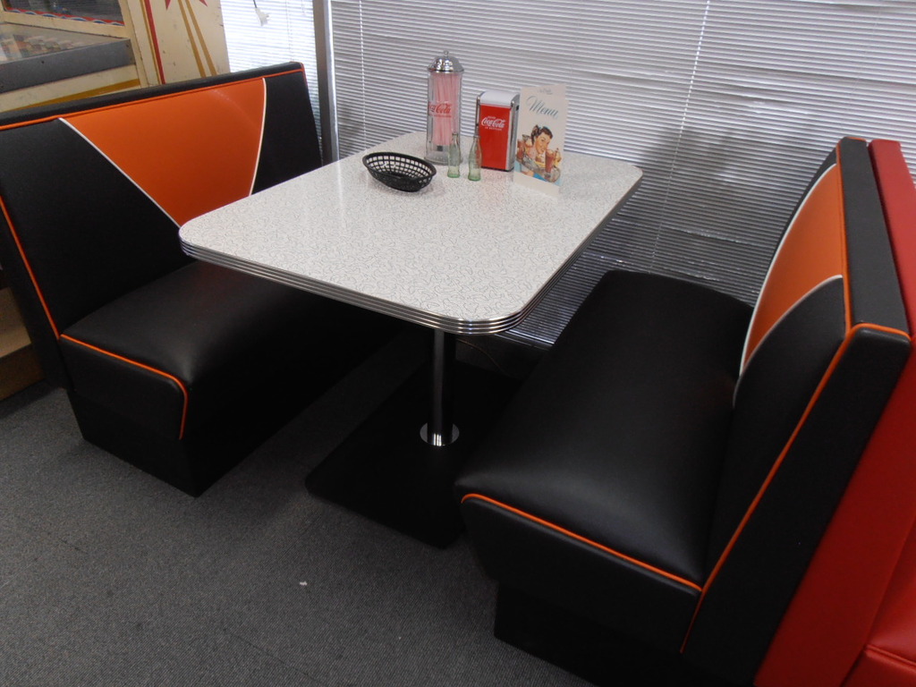 Booth Tables are generally 42" with retro laminate and alluminium edge banding. Bases are generally heavy grade Black Cast Iron with thick Chrome Pedestals. Most popular table laminates are Gloss white,Glacier, Red Glacier, Cracked Ice varieties, and Turquoise.