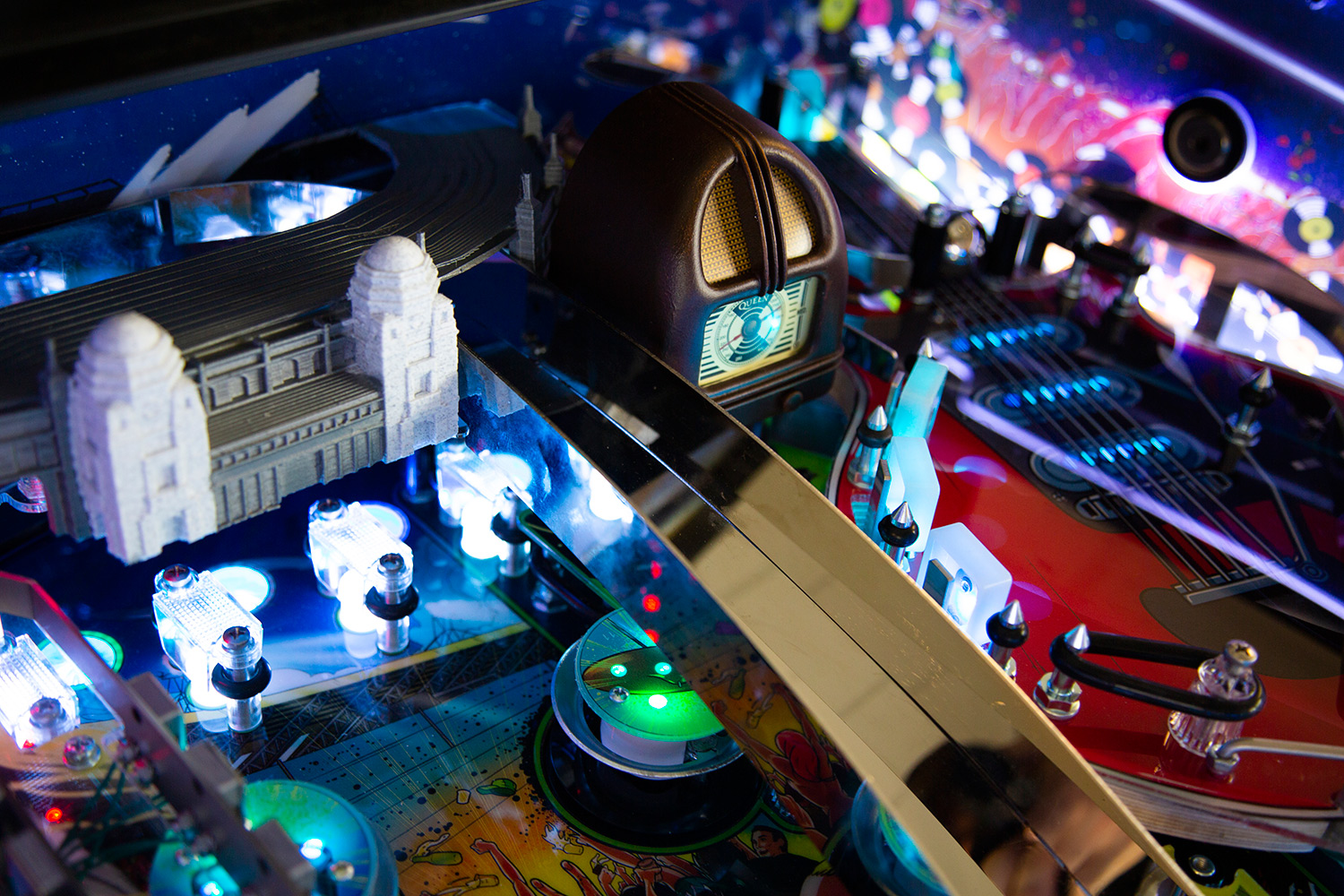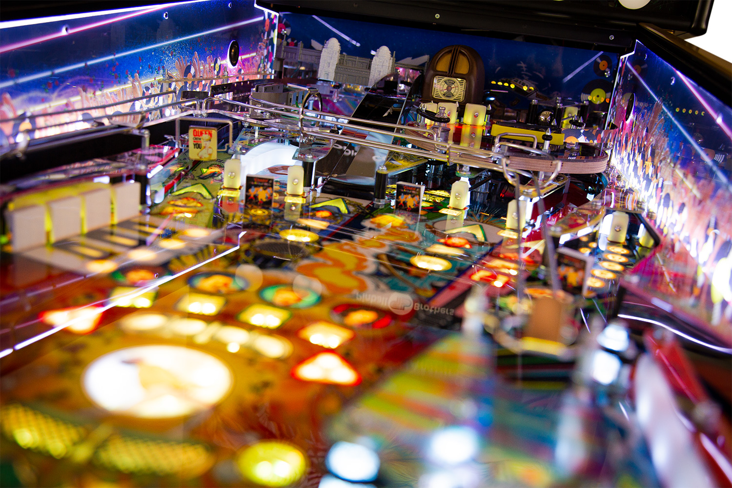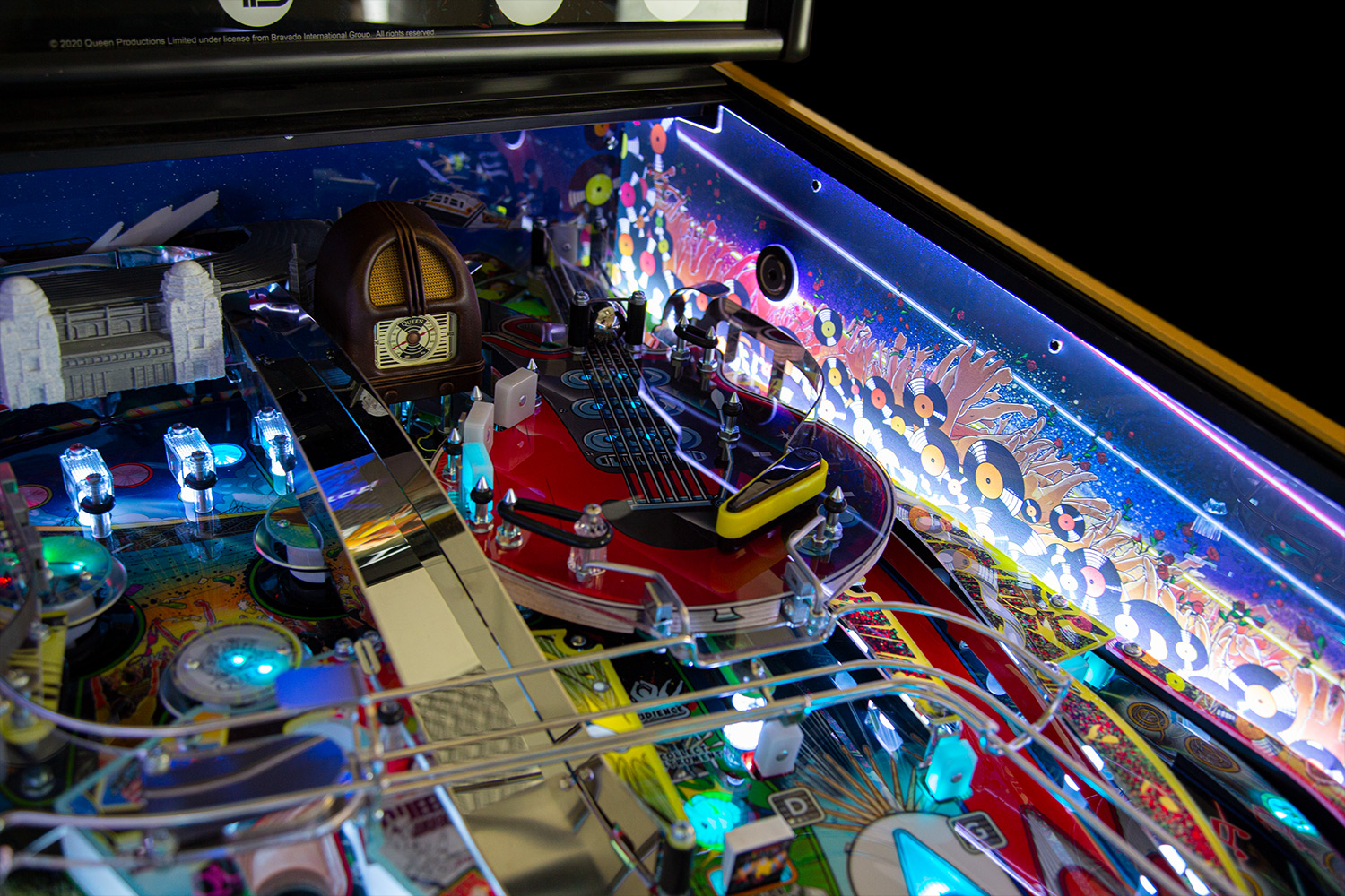 The game features 14 live songs accompanied by call outs by the band, exclusively recorded for the game. Featured also is Brian May’s legendary Red Special guitar, in the shape of an upper playfield where you can lock balls to start the Red Special multiball. Or you can visit the epic Wembley Stadium to lock balls