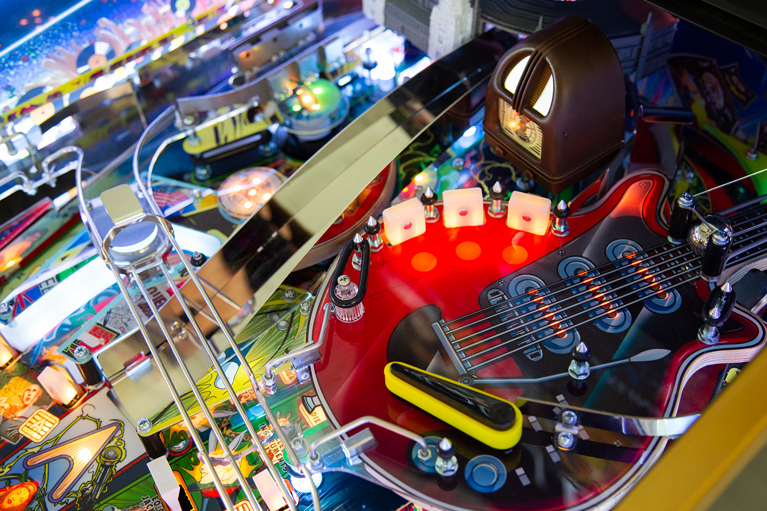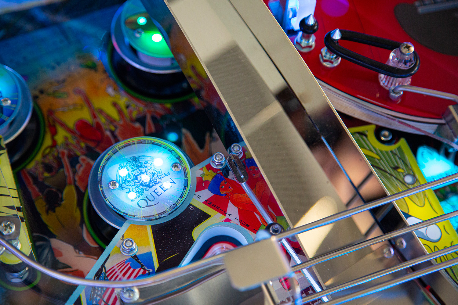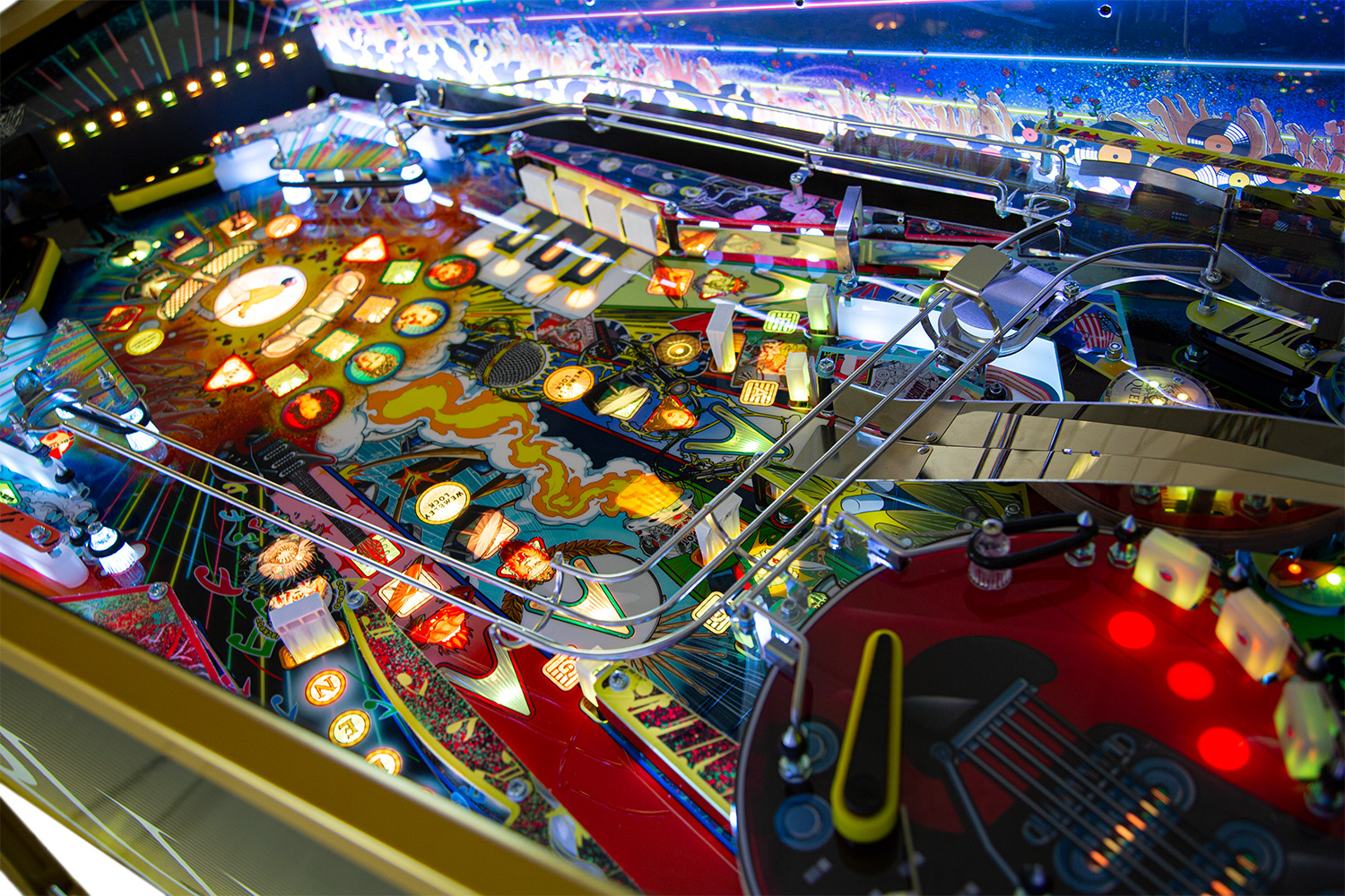The game features 14 live songs accompanied by call outs by the band, exclusively recorded for the game. Featured also is Brian May’s legendary Red Special guitar, in the shape of an upper playfield where you can lock balls to start the Red Special multiball. Or you can visit the epic Wembley Stadium to lock balls